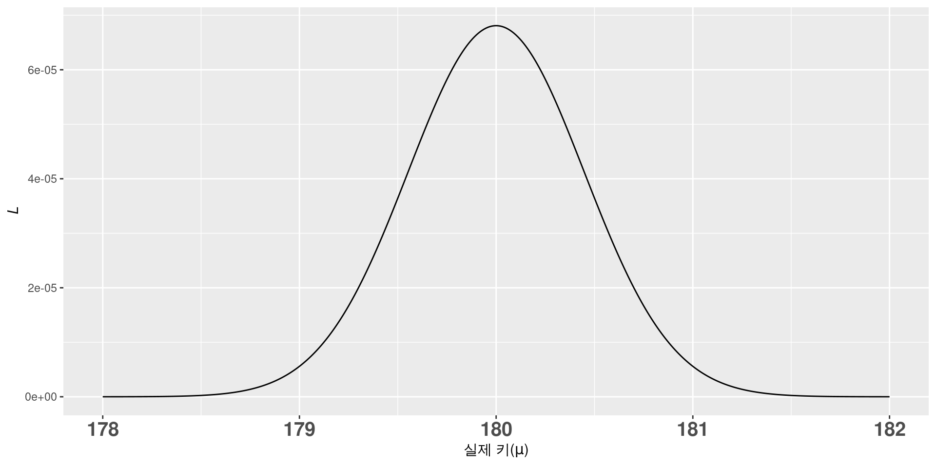 \(L\)이 최대이려면 \((178-\mu)^2+(179-\mu)^2+(180-\mu)^2+(181-\mu)^2+(182-\mu)^2\)이 최소여야 함. \(\mu=180\)일 때 최소.
