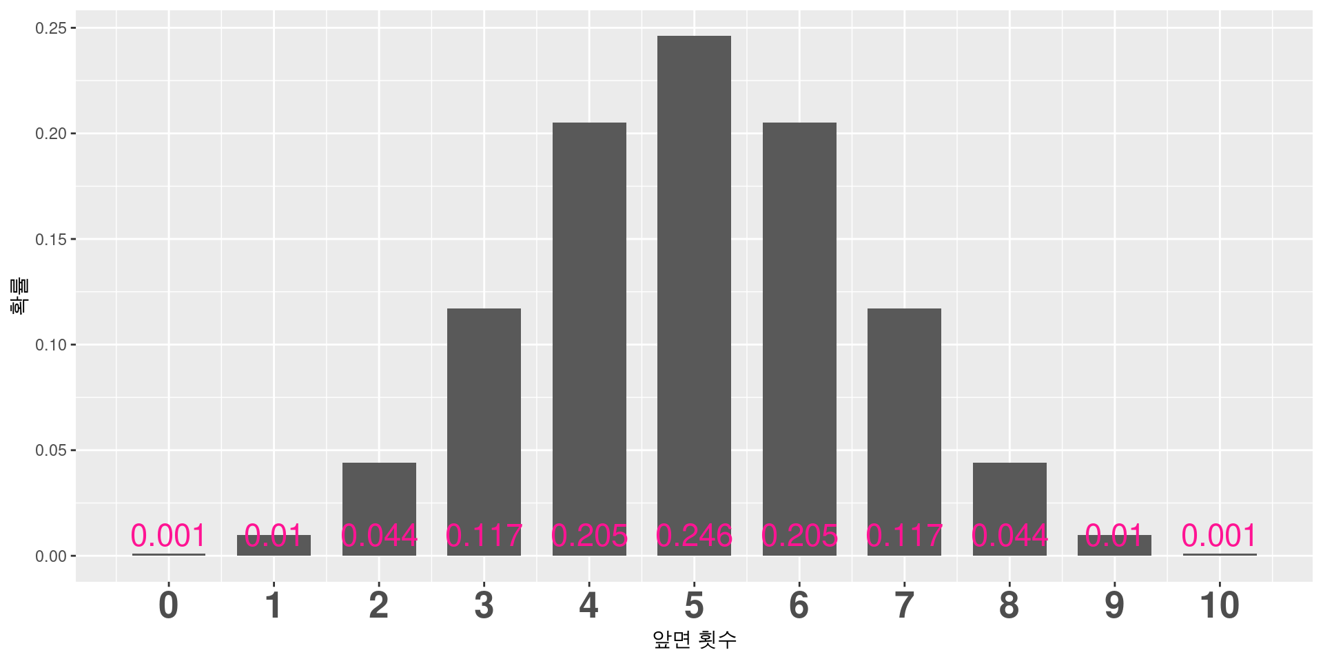 동전 10번 던져서 앞면 갯수 세기 를 3회 시행하여 앞면이 2,5,7번 나올 확률