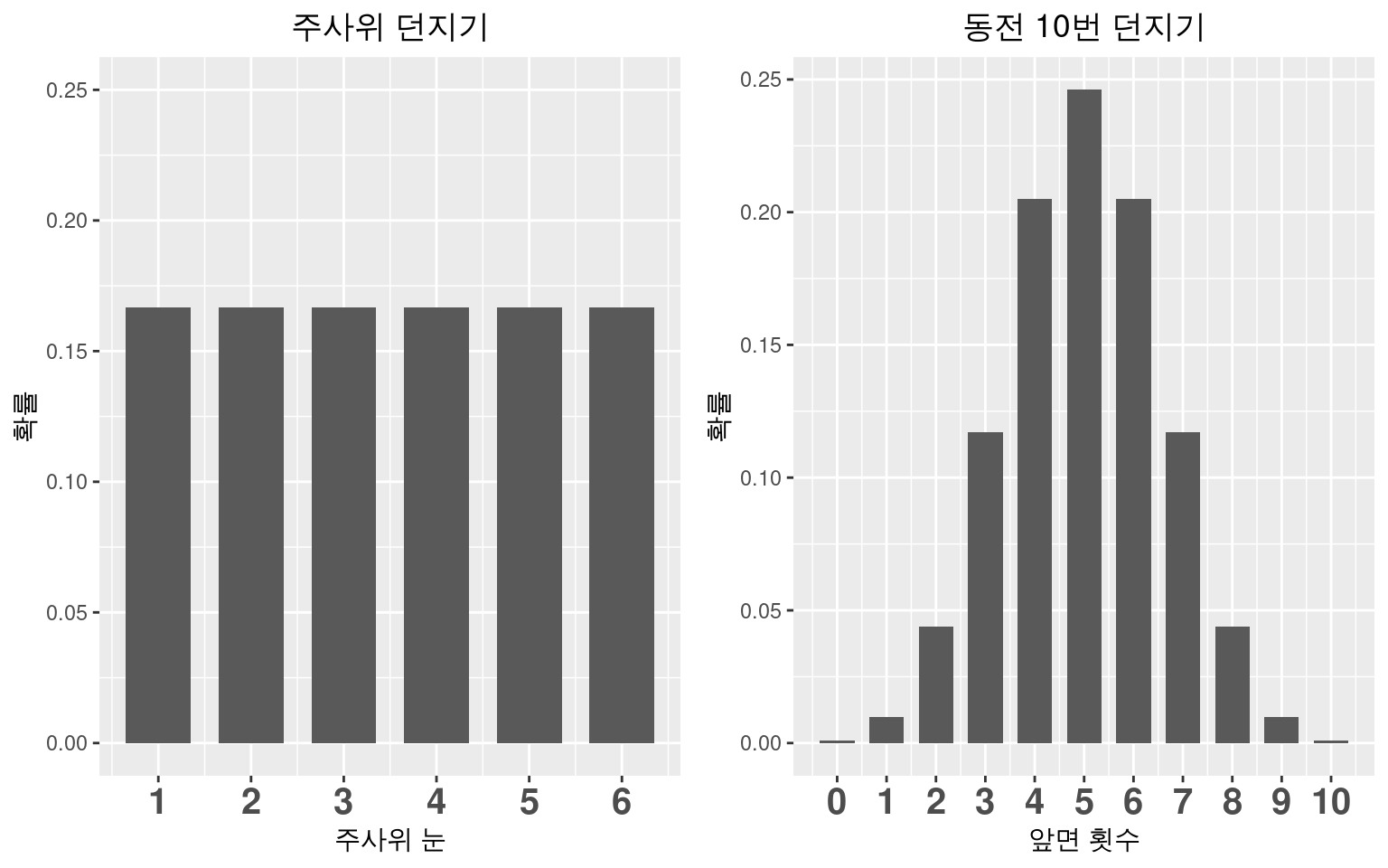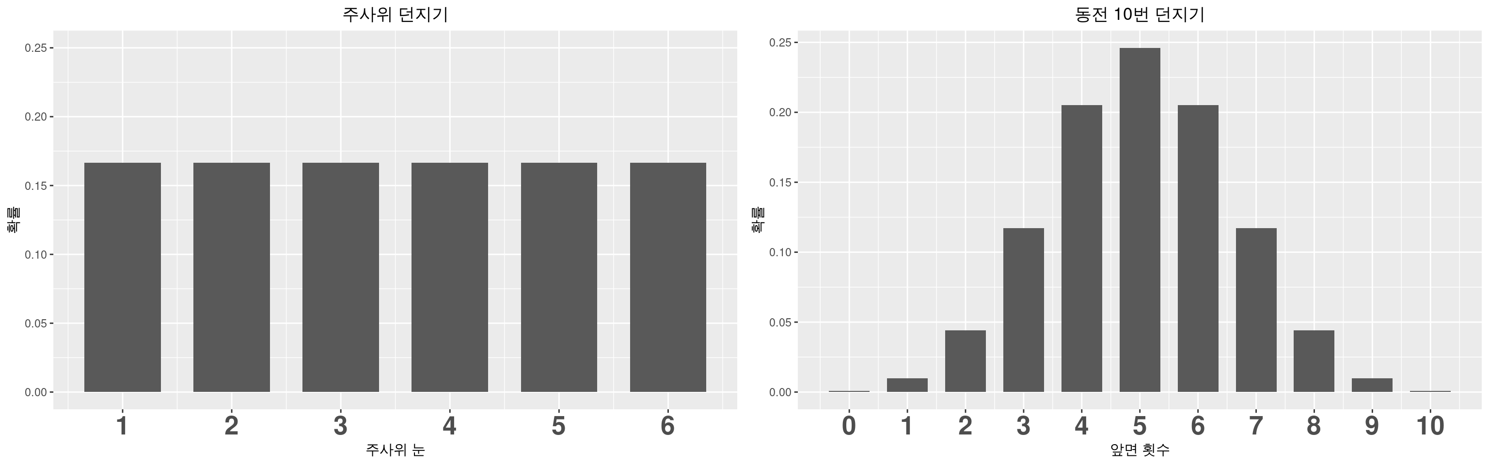 이산사건 확률 = 가능도 이므로 각 예시의 가능도도 \(\frac{1}{216}\)과 0.001