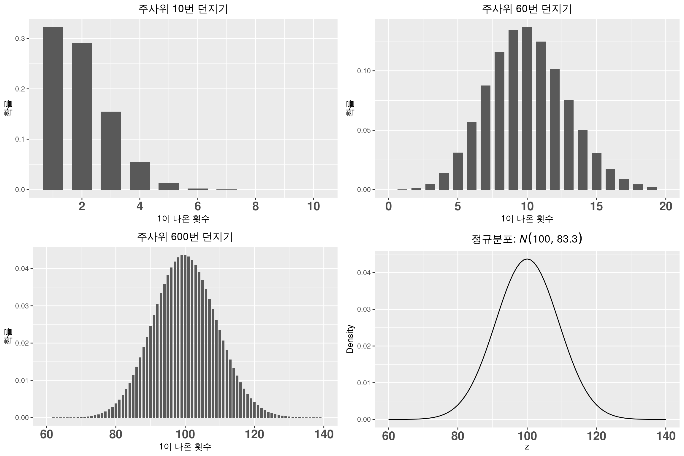 - \(B(600,\frac{1}{6}) \simeq N(600\times \frac{1}{6}, 600\times \frac{1}{6} \times \frac{5}{6})\)