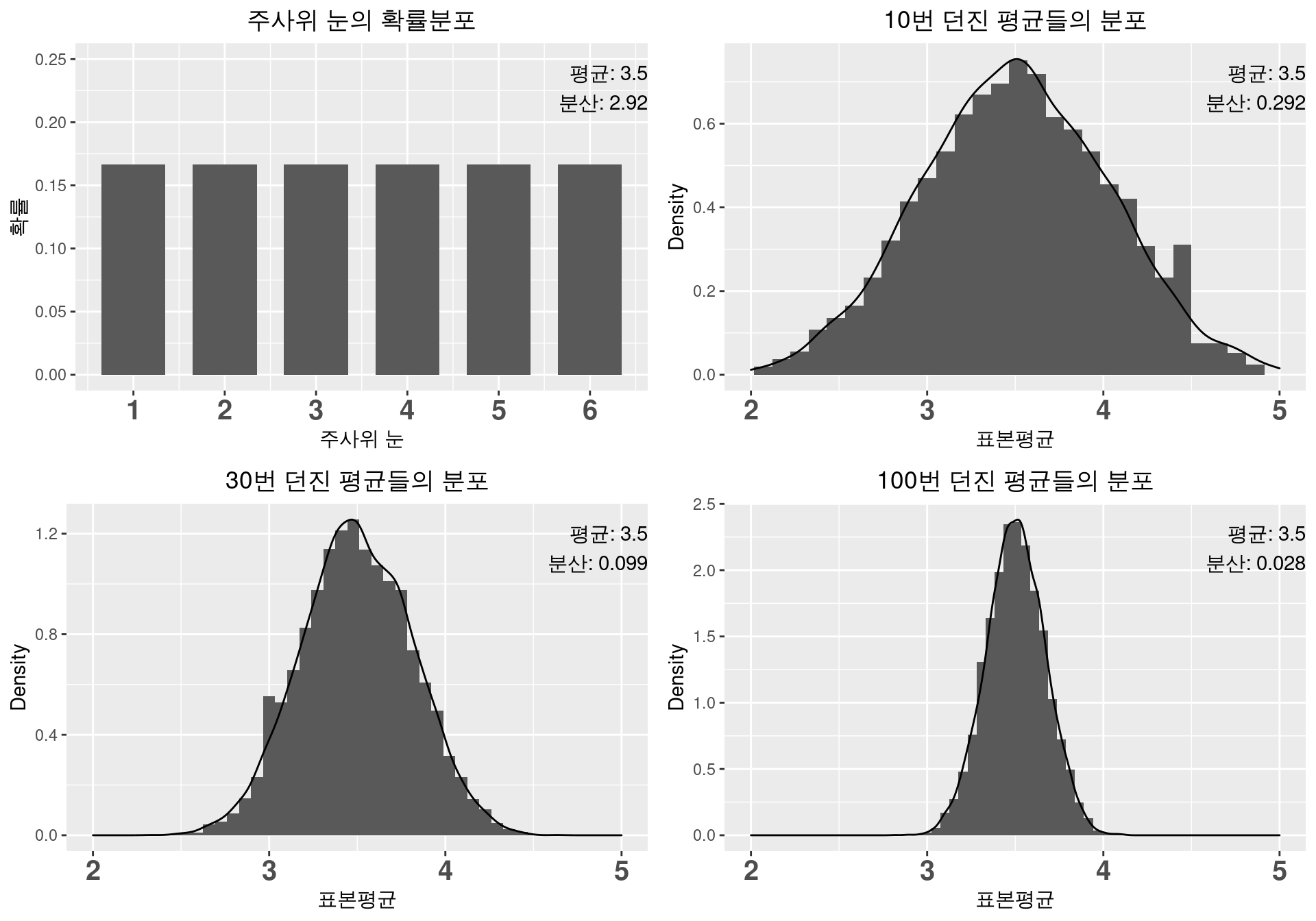 - 주사위눈 평균(\(\mu\)): \(\frac{1+2+3+4+5+6}{6}=3.5\), 분산(\(\sigma^2\)): \(\frac{(1-3.5)^2+(2-3.5)^2+\cdots+(6-3.5)^2}{6}\approx 2.92\)
