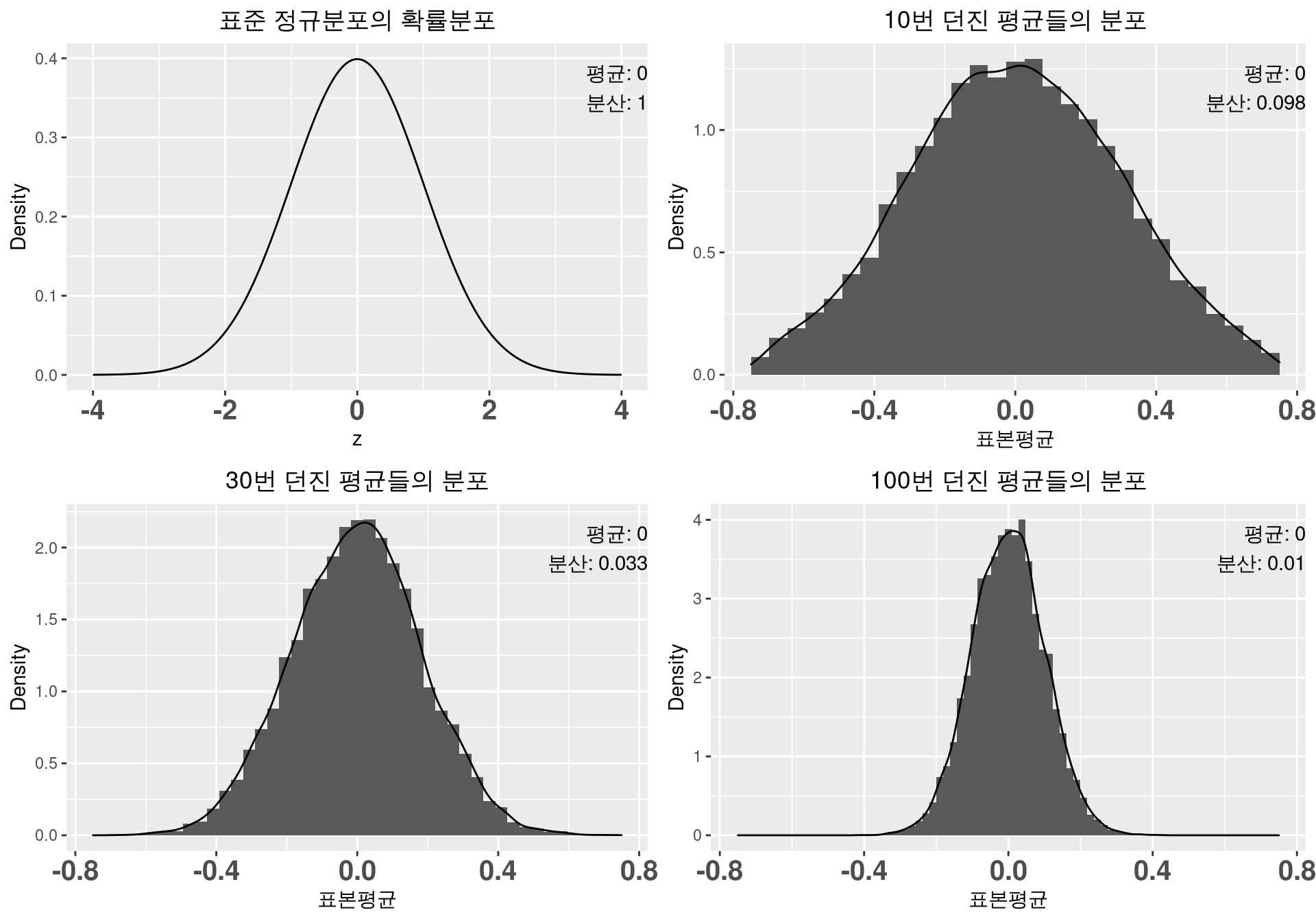 - 표준 정규분포(\(\mu=0\), \(\sigma^2=1\))에서 \(n\)개 뽑아 평균내기